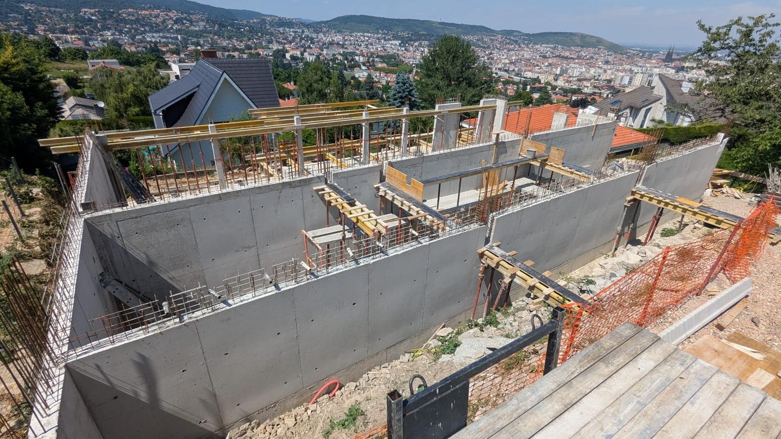 Chantier technique sur terrain en pente, nécessitant une expertise pointue en coffrage, ferraillage et coulage béton. Construction de murs de soutènement en béton armé pour une structure en plusieurs niveaux, avec vue dégagée sur l’agglomération clermontoise. Ce type de réalisation met en avant le savoir-faire de Batipro sur des projets à fort enjeu structurel et architectural.